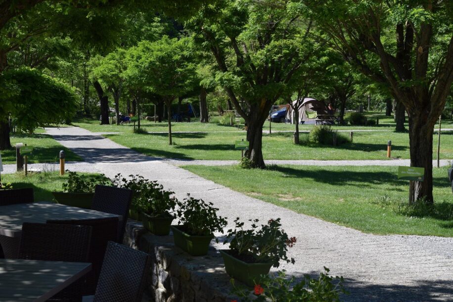 De kampeerplaatsen liggen op een groen en met gras begroeid kampeerterrein onder de schaduw van de acaciabomen. U kunt gebruikmaken van een elektriciteitsaansluiting. Er zijn verschillende plekken, zoals ruime plaatsen met uitzicht op de rivier of kleinere plekken tussen de lavandelstruiken. Naast traditioneel kamperen zijn er ook mobilhomes, ecolodges en huisjes op palen te boeken op de camping. In het hoogseizoen zijn de bar en het restaurant geopend. Verder is er een kleine campingwinkel met broodservice voor vers brood in de ochtend.